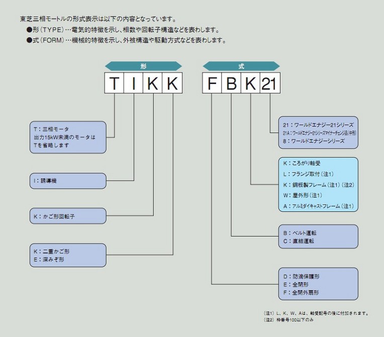 도시바 삼상 모터 형식 표시는 다음의 내용으로 되어있습니다.
